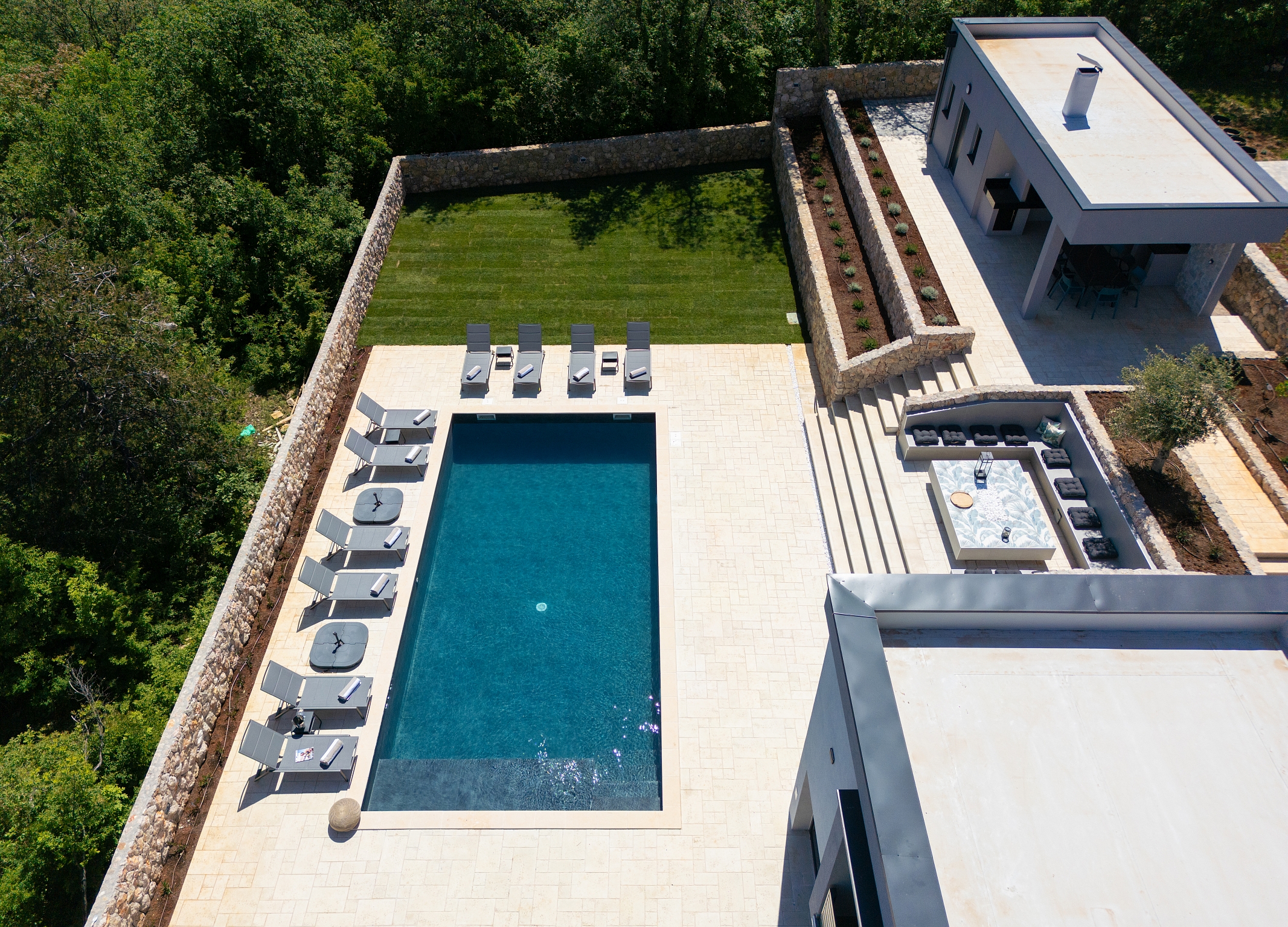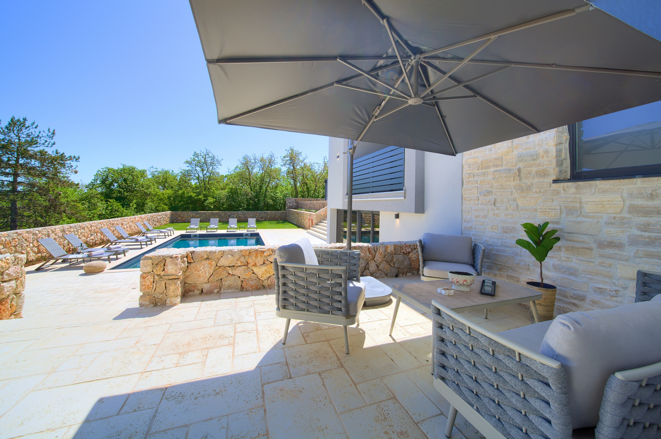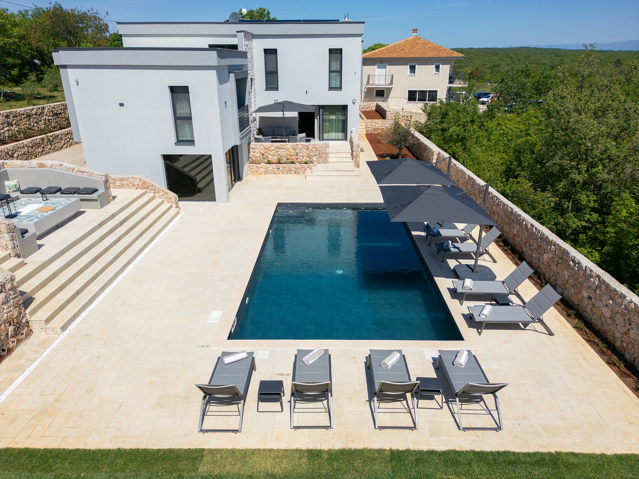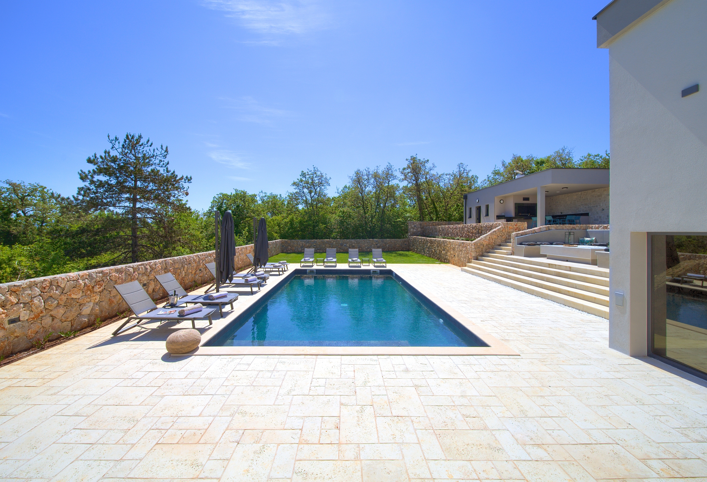 Bazen 50m2 / grijani - sjenica s roštiljem i vanjskom kuhinjom - stol za blagovanje za 12 osoba - sunčalište s 10 ležaljki - 4 suncobrana - travnjak - lounge zona sa stolom i vanjskom kutnom garniturom - potpuno ograđeno dvorište - WiFi