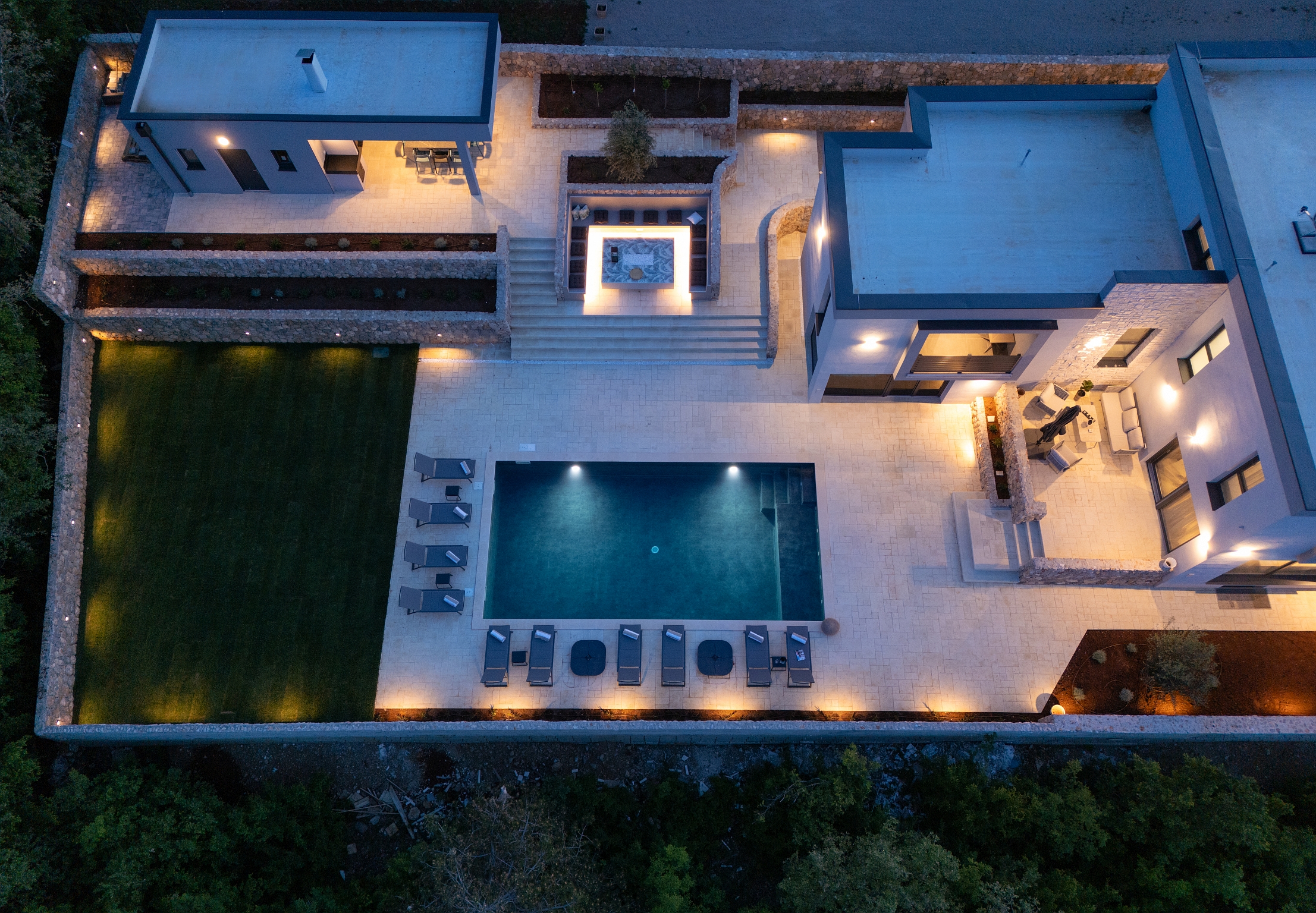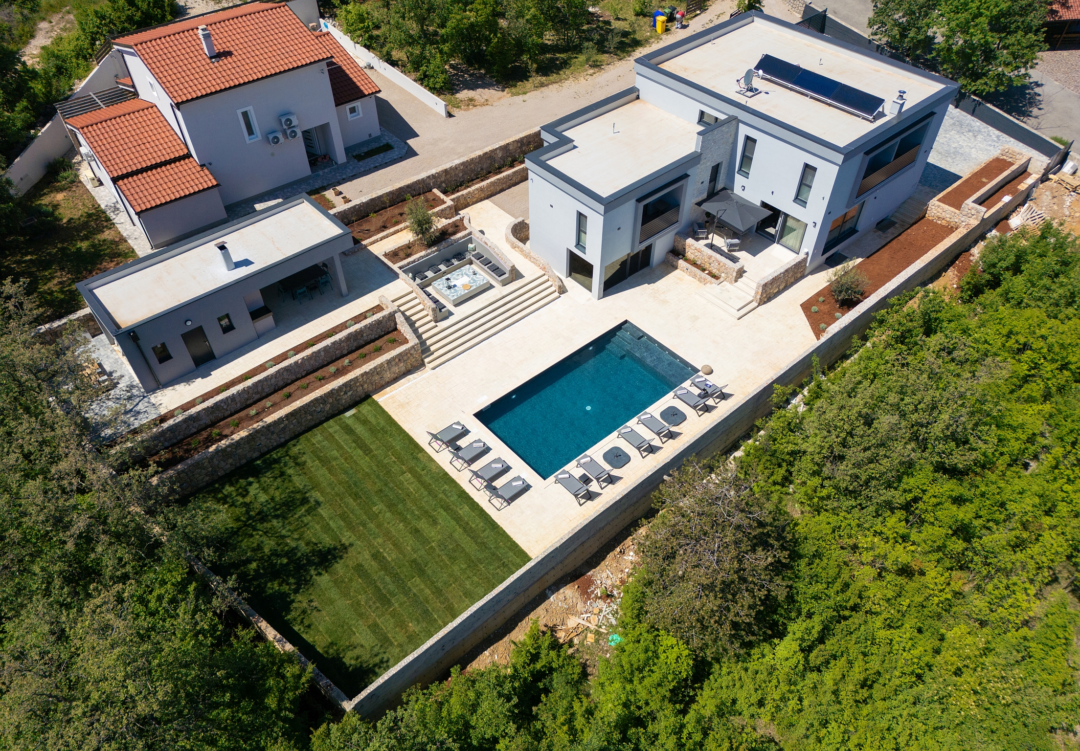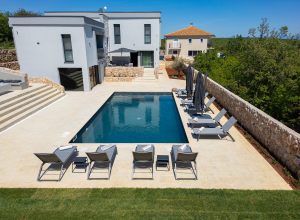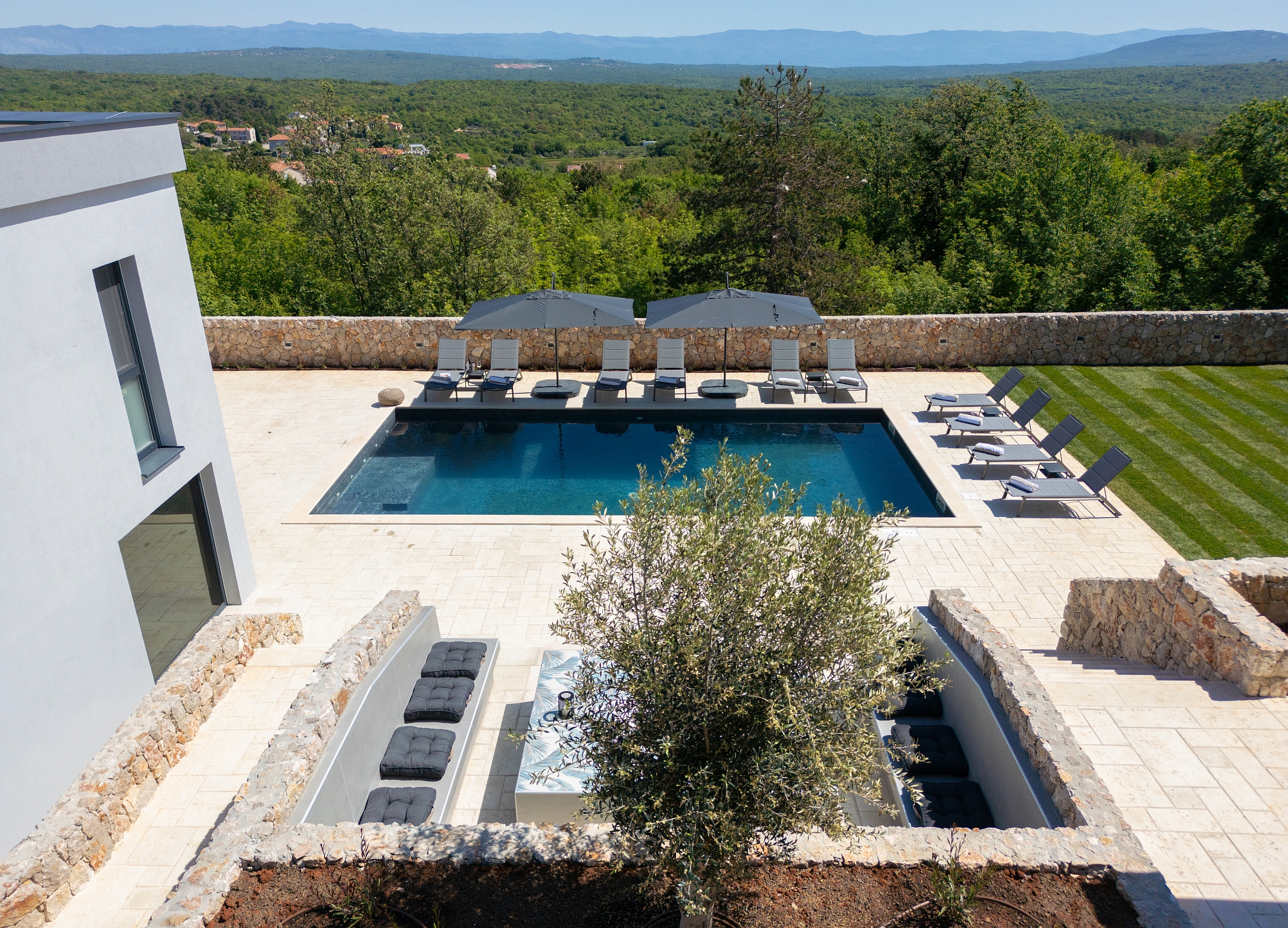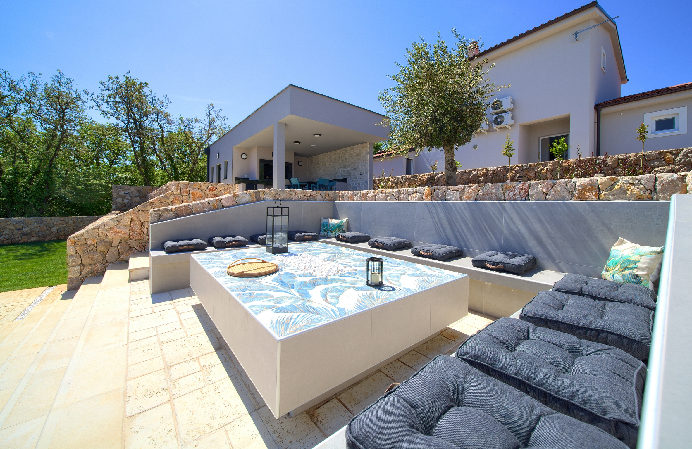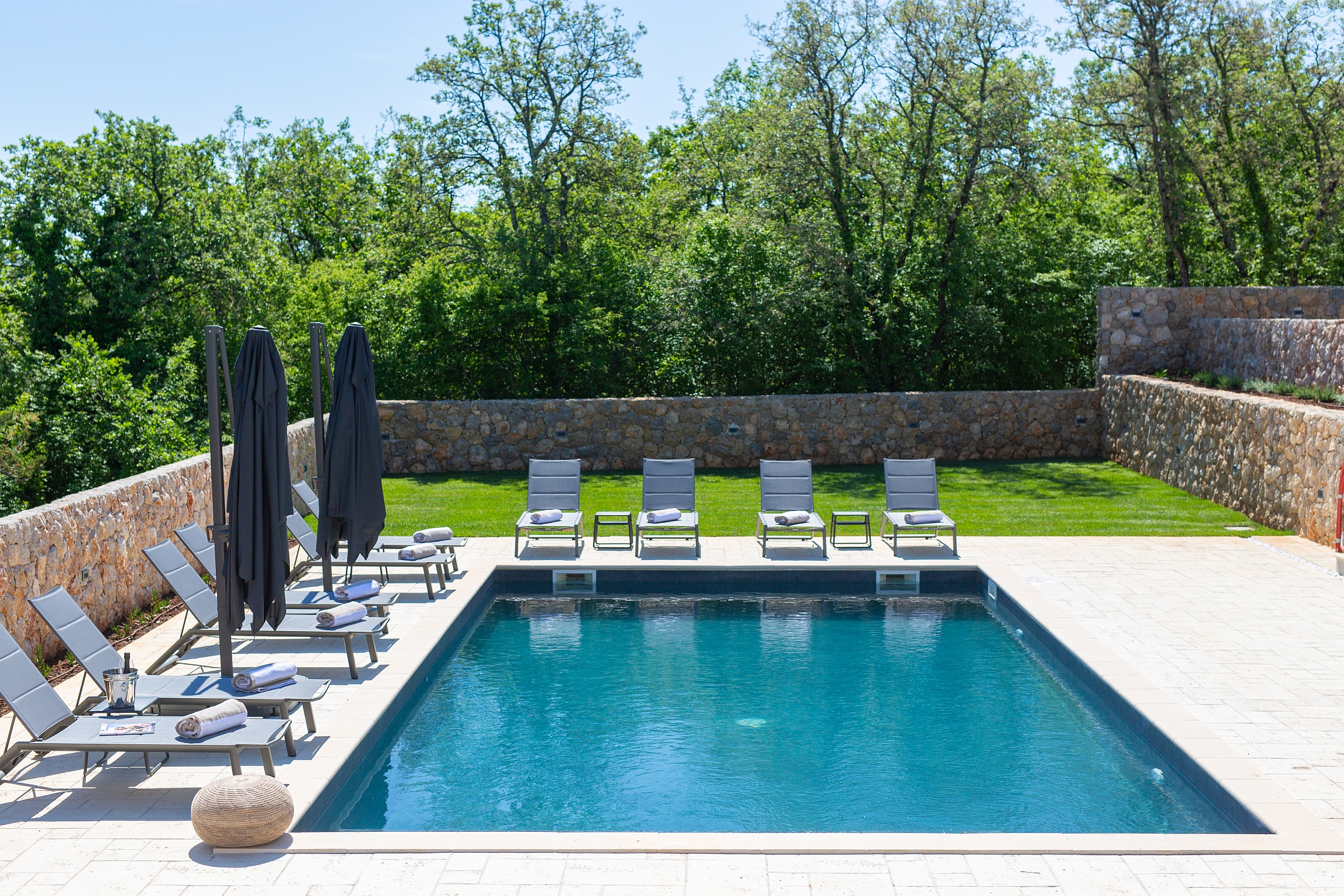 Bazen 50m2 / grijani - sjenica s roštiljem i vanjskom kuhinjom - stol za blagovanje za 12 osoba - sunčalište s 10 ležaljki - 4 suncobrana - travnjak - lounge zona sa stolom i vanjskom kutnom garniturom - potpuno ograđeno dvorište - WiFi