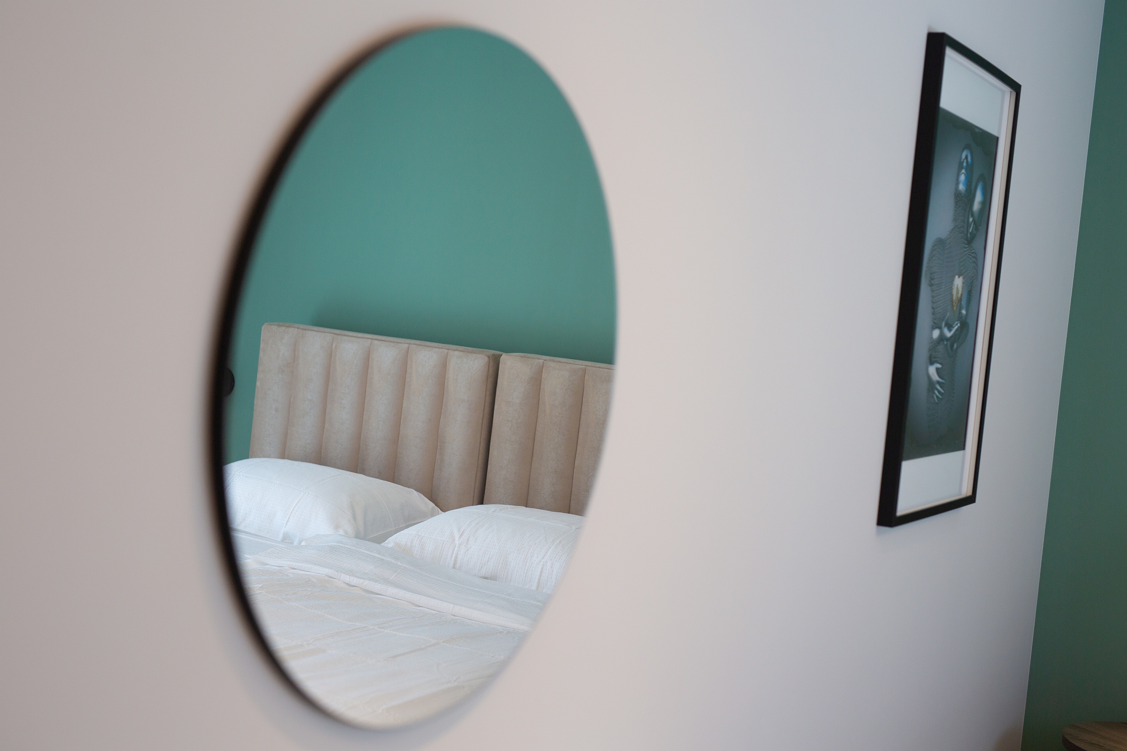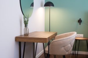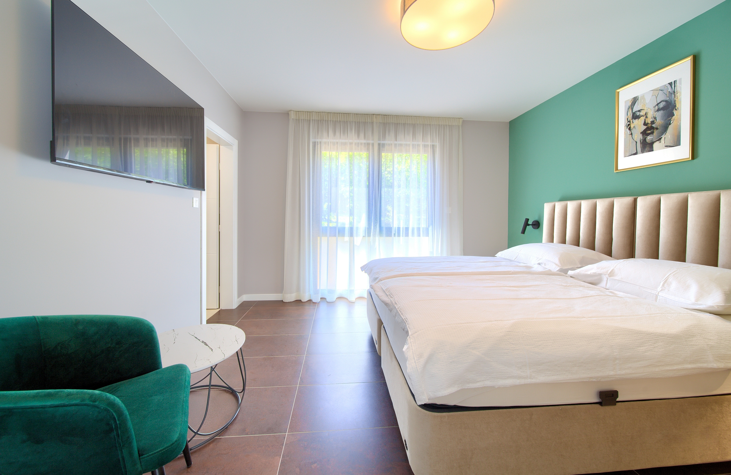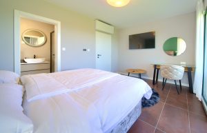 Kvadratura 16m2, veliki bračni krevet sa luksuznim madracem dimenzija 180x200cm. Soba sadrži ormar, noćne ormariće, stolić i toaletni/radni stol s foteljom.
